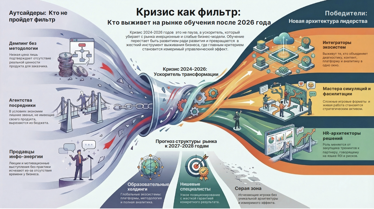 Именно поэтому следующие два-три года станут для рынка корпоративного обучения не просто турбулентностью — это будет полноценная перестройка. И вопрос не в том, переживёт ли рынок. Вопрос в том, кто окажется по другую сторону этого перехода — и с чем.