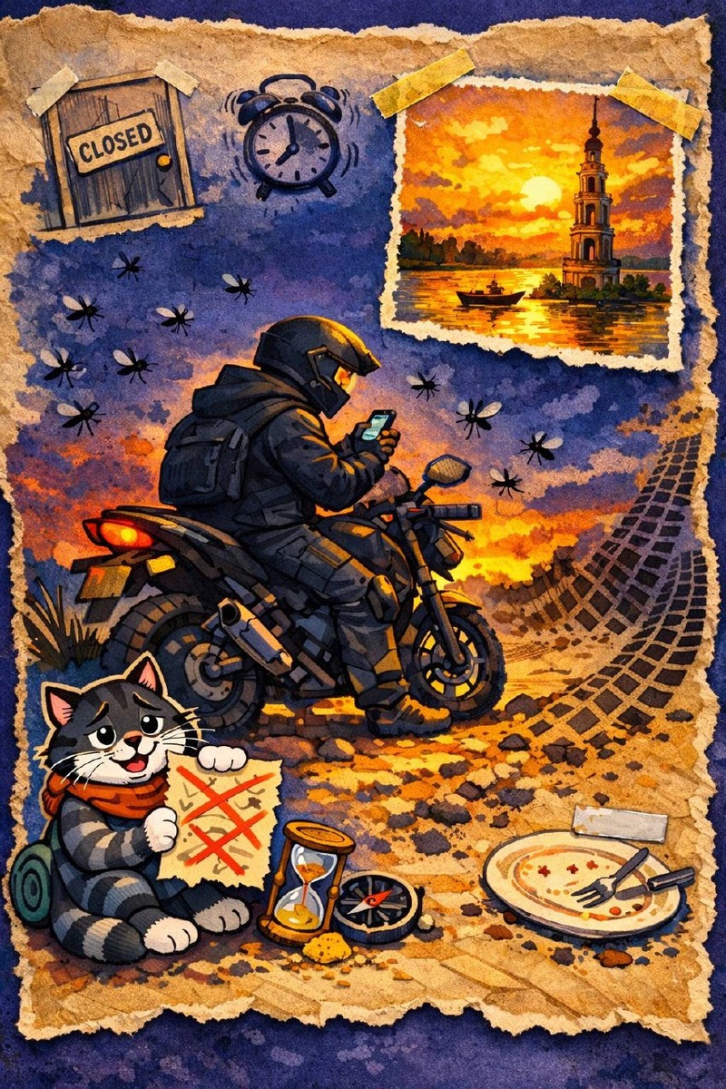 🦟🌅🏍️ Многие из вас помнят нашу легендарную историю про Калязин? Ту самую, где мы тащили мотоциклы по песчаной дороге, где колеса тонули в песке, отбивались от туч комаров и смеялись до слёз, пока искали лодочную станцию (если интересно, ссылка на пост с этой историей https://dzen.ru/media/veter_dorogi/zima-nakonec-vstupila-v-svoi-prava--belaia-pushistaia-so-snejkami-i-legkim-oscusceniem-chto-pora-vytaskivat-iz-garaja-teplye-noski-6962bb45b0b43c6d4fca144d). Так вот, давайте немного приоткроем занавес: та поездка начиналась как полный хаос. Всё случилось достаточно спонтанно: ребята позвали в Калязин, но никакого плана не было — не искали и не бронировали столики в кафе, о лодках на прокат вообще никто не думал, да и сбор колонны превратился в квест: встречались кто где по пути, объединялись на заправках. В итоге вся группа собралась только на подъезде к городу, а время неумолимо уходило. Первым ударом стал голод: поскольку о том, где обедать, заранее никто не побеспокоился, мы прин