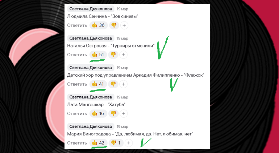 Ставим палец вверх тем песням, которые нравятся.