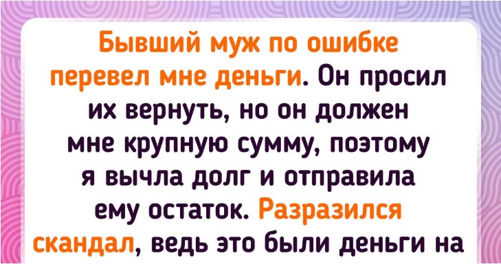 - Несколько дней назад мой бывший муж по ошибке перевел мне большую сумму денег. Это было рано утром, я спала, а когда проснулась, обнаружила сотню пропущенных звонков и сообщений с просьбой вернуть деньги. Но дело в том, что он давно должен мне крупную сумму (я дала ему в долг уже после развода, когда он был на мели и без работы), поэтому я вычла эти деньги и отправила ему остаток. Разразился скандал! Оказалось, что он накопил денег, чтобы купить своей новой девушке обручальное кольцо, а теперь помолвка сорвана. Теперь его девушка шлет мне гневные сообщения в соцсетях, да и родители бывшего, с которыми у меня были теплые отношения, на его стороне. У нас четверо общих детей, и я даже не вычла просрочку по алиментам. Я имела право так поступить?