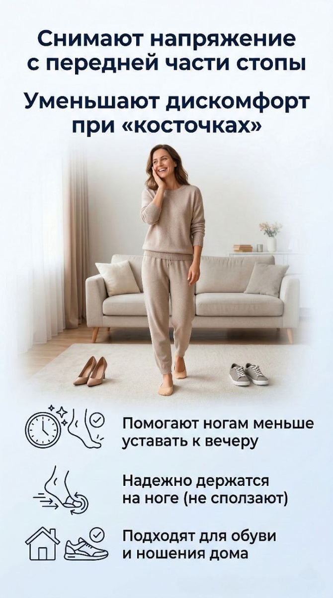 передней части стопы или не начинают сильно беспокоить выпирающие «косточки». Особенно с годами нашим стопам становится всё сложнее справляться с ежедневной нагрузкой. Из-за этого появляется тяжесть, которая постепенно передается на все суставы, мешая наслаждаться прогулками и превращая обычные домашние дела в испытание. Чтобы вернуть легкость походке и разгрузить стопы, отлично помогают специальные тканевые полустельки (подушечки под стопу) с мягкой вставкой из медицинского силикона. Как они работают и в чем их главная польза: Снимают боль и напряжение. Мягкая силиконовая подушечка берет на себя основную нагрузку при ходьбе. Передняя часть стопы расслабляется, и к вечеру ноги чувствуют себя намного легче. Защищают при деформации пальцев. Полустельки аккуратно разделяют пальцы, помогая уменьшить трение и болезненные ощущения при «косточках» на больших пальцах или мизинцах. Удобно сидят на ноге. В отличие от обычных стелек, они надежно фиксируются прямо на вашей стопе и совершенно не съ