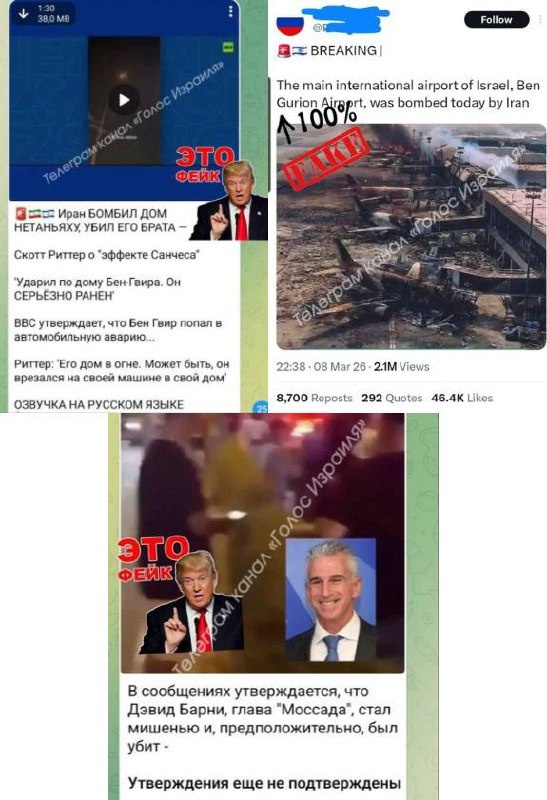 - В Иерусалиме и Беэр-Шеве не только появились морские порты, но и море, которого там отродясь не было — прямо тектонические изменения земной коры. - 100500 раз «уничтожили» аэропорт Бен-Гурион, а на следующий день сообщают, что все израильтяне «бегут» из Израиля через аэропорт Бен-Гурион. - Уже по 150 кругу ликвидировали Нетаньяху, Бен-Гвира, главу Моссада и других израильских чиновников. - Как они в очередной раз «стерли с лица земли» Тель-Авив и он весь в «руинах». - Или как они «угнали» американский истребитель B-21 raider, взяв в плен летчиков, которые всегда почему-то оказываются израильскими певцами — от Макаревича до Эяль Голана. И другие навыдуманные «великие победы» о которых невозможно молчать. Эти сгенерированные нейросетью фейки, созданные Ираном и его прокси, с целью создать иллюзию хоть какого-то «успеха». Поделитесь с друзьями и знакомыми, чтобы об этом узнало как можно больше людей. ____________ 🎙Будь в курсе событий 🇮🇱 Подпишись на «Голос Израиля»