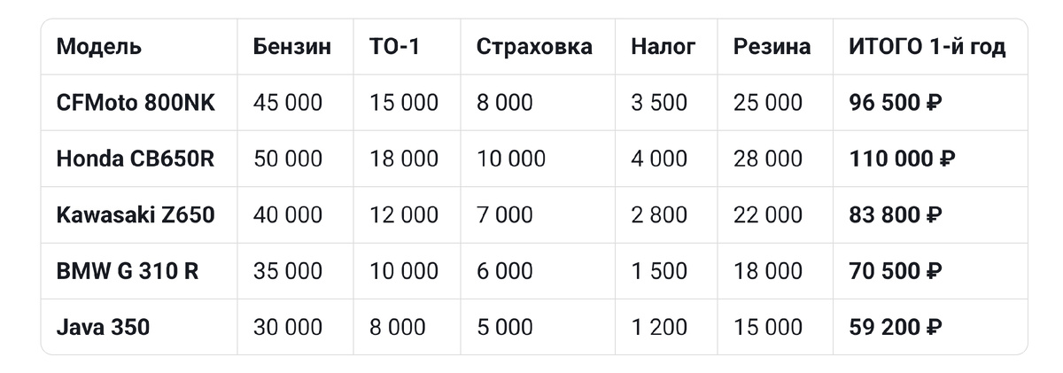 Ты накопил 800 тысяч — 1 миллион рублей. Поздравляю! Уже можно выбирать мотоцикл. Но стоп. Ты уверен, что этих денег хватит? Я, Дмитрий НЕдиванный, посчитал реальную стоимость владения для пяти популярных моделей в этом ценовом сегменте. Спойлер: мотоцикл — это не только цена на ценнике. Берём три года эксплуатации (средний срок, после которого многие продают или меняют). Учитываем: 📉 Таблица 1. Расходы за первый год владения Цены примерные, регион — Центральная Россия, пробег 10 000 км, бензин АИ-95 по 55–60 руб. 📊 Таблица 2. Расходы за три года (суммарно) Во второй и третий год меньше расходов, потому что резину купили в первый, а ТО дешевле. 🧠 Что важного в этих цифрах Чтобы купить и спокойно ездить три года, тебе нужно: Для CFMoto 800NK: 950 000 (покупка) + 230 000 (содержание) + 70 000 (минимум экипировки) = 1 250 000 ₽ Для Kawasaki Z650 (бюджетный вариант): 820 000 + 200 000 + 70 000 = 1 090 000 ₽ Для Java 350 (если готов к приключениям): 850 000 + 140 000 + 70 000 = 1 060 000