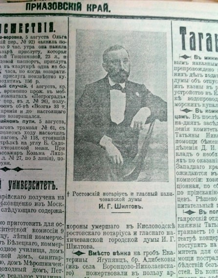 О ростовском нотариусе и гласном Нахичеванской думы Иване Григорьевиче Шилтове очень трогательный некролог написал известный общественный деятель и публицист Григорий Чалхушьян.