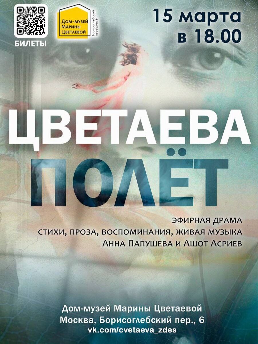 🗓 15 марта 18:00 📍 Дом-музей Марины Цветаевой 💵 от 800 ₽ Купить билет скидка 30% по промокоду vesna В воскресенье, 15 марта в доме-музее Марины Цветаевой состоится спектакль «Цветаева. Полет». Драма создана на основе воспоминаний и текстов поэтессы и дополнена трогательным музыкальным сопровождением. Читает и проживает стихи и прозу актриса Анна Папушева. За музыку отвечает мастер импровизаций Ашот Асриев. Продолжительность спектакля — 1,5 часа. #спектакль Подпишись на Куда пойти в Москве