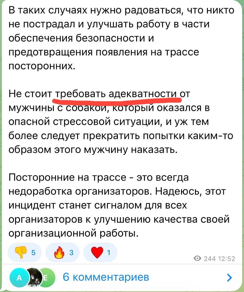 Раз чел гуляет в парке с собакой, значит с достаточно высокой вероятностью живёт где-то рядом и знает, что каждый год в одно и то же время в этом парке проводятся соревнования. Соревнования, о которых на каждом углу тебя предупреждают. Но вдруг это стало неожиданностью для товарища гуляющего. Ну-ну. Тем более он там в своём обращении указывает, что сам занимается спортом, т.е. должен понимать, что такое массовые спортивные мероприятия. А он из себя строит эдакую снежинку, которую должны бережно взять на ручки и отнести в безопасное место, чтобы не дай бог его случайно не задел один из совсем неслучайных лыжников на трассе. А потом вот из-за таких жалующихся гуляющих прикрывают старты в интересных локациях. Лучше бы вместо жалоб сам встал на лыжи.