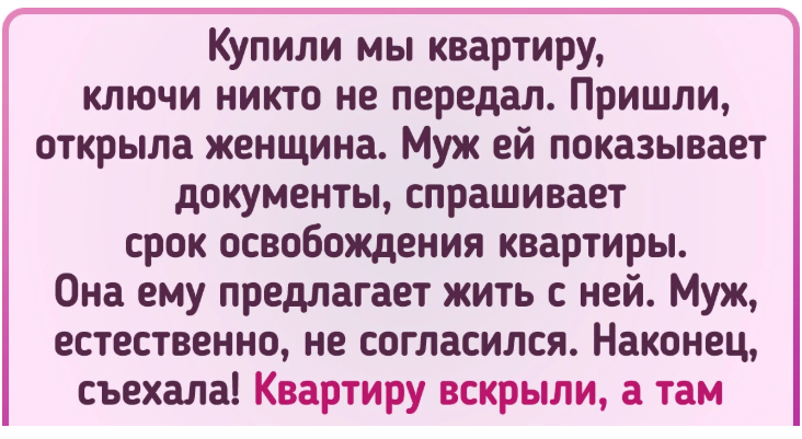 - Купили мы квартиру, ключи никто не передал. Пришли, открыла женщина. Муж ей показывает документы, спрашивает срок освобождения квартиры. Она ему предлагает жить с ней. Муж, естественно, не согласился. Наконец, съехала! Квартиру вскрыли, а там все специально испачкано! Выключатели, краны, батареи, стены, потолки.