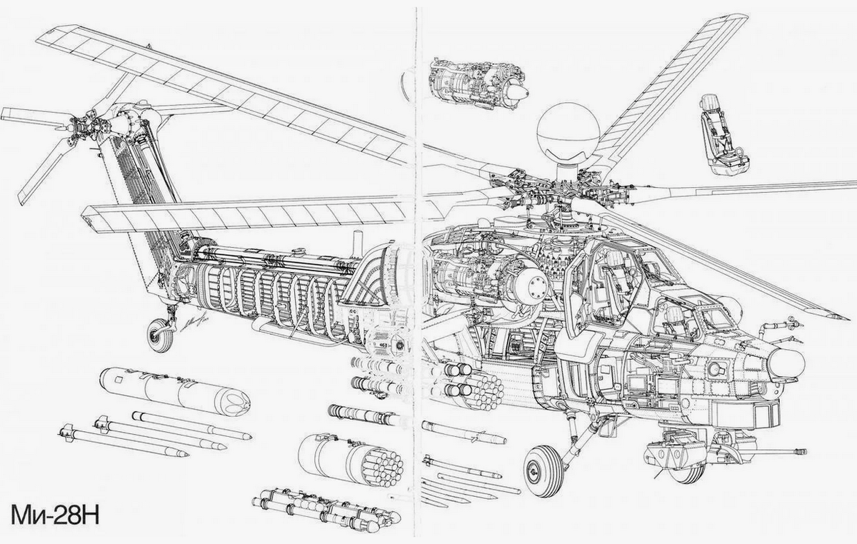 Двигатели на Ми-28 разнесли по бокам фюзеляжа. Зачем? Чтобы один удачный выстрел из ПЗРК не поразил оба мотора. Если подбили левый — правый тянет, вертолет летит дальше. Плюс двигатели прикрывают главный редуктор — самый уязвимый узел.