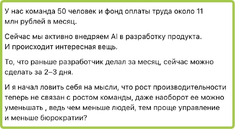 рублей ФОТ на 50 человек программистов, но это ладно - а вот интересно то, что люди приходят к тому, что ИИ реально позволяет сделать больше меньшим коллективом. Факт. Почитайте, занятное. @bezsmuzi
