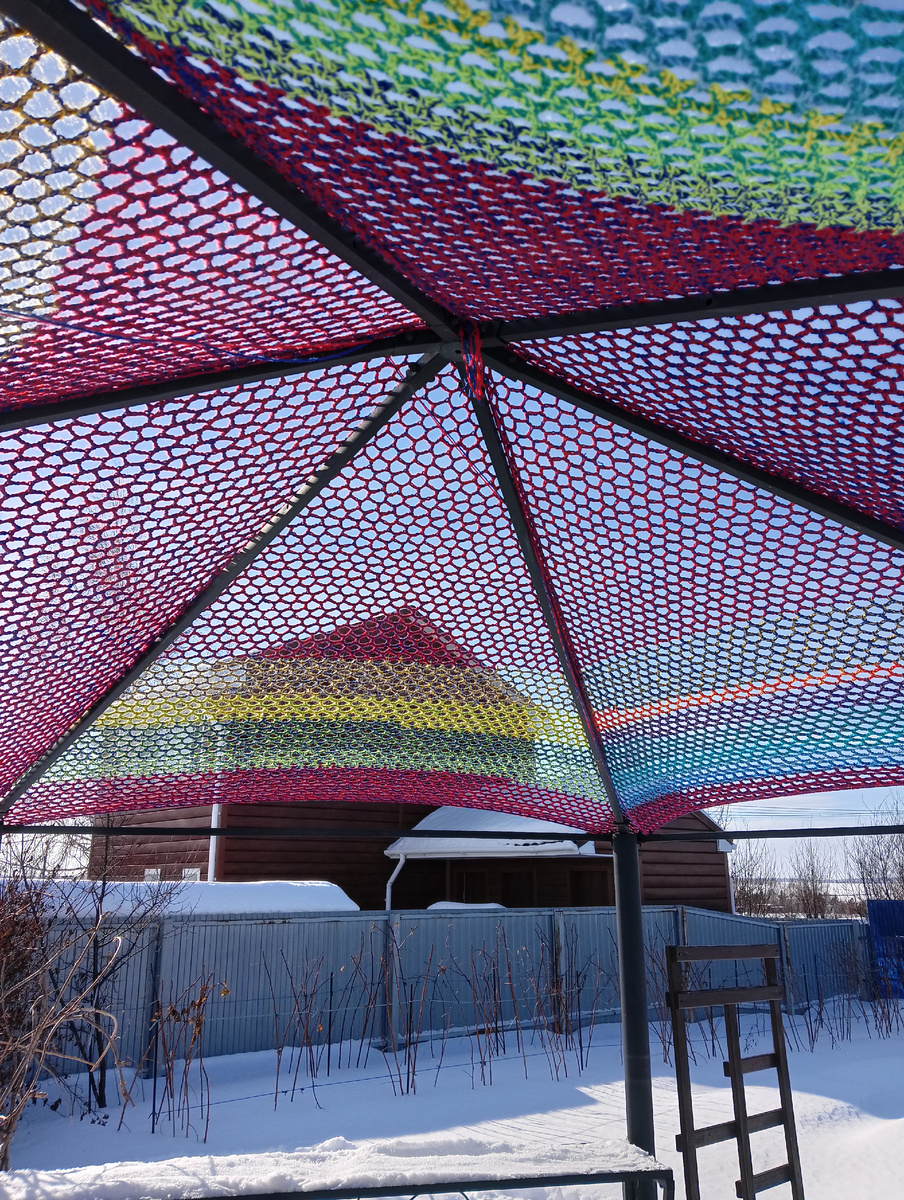 Всем привет.. Три года назад я связала крючком тент для беседки. Из остатков пряжи. Получился разноцветный, и очень яркий..