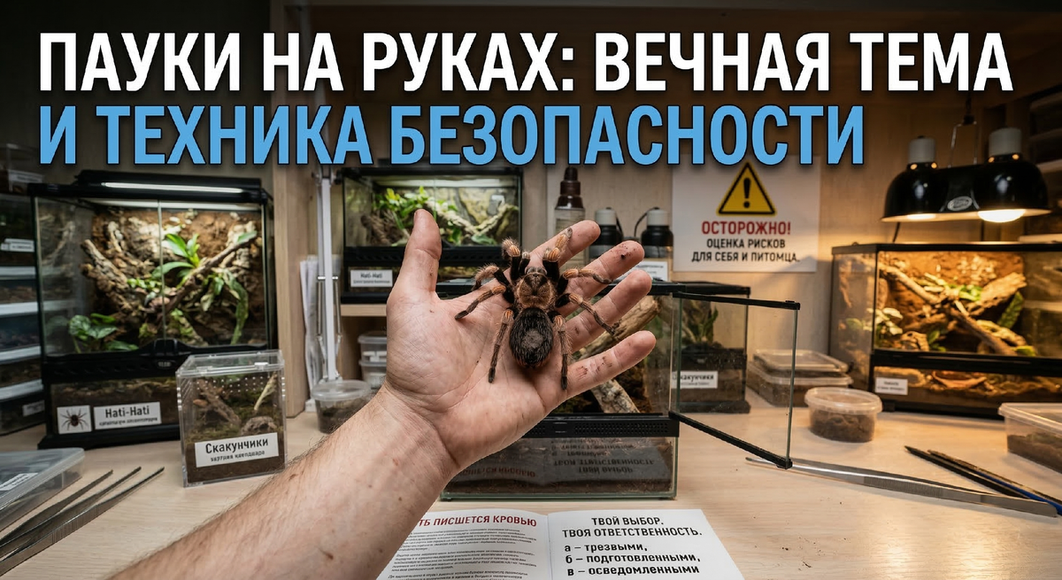 🕷 Вновь возвращаемся к теме пауков и других питомцев на руках — пожалуй, одной из вечных тем в киперском сообществе. 🤔 📷 В нашем Уютном чате часто можно увидеть фото и видео с пауками на руках. Это личное дело каждого взрослого человека: бегать за всеми с тапком и навязывать свое мнение — занятие неблагодарное. Техника безопасности пишется кровью, а в нашем случае — личным опытом. Взрослым людям мы рекомендуем быть: Птицееды, сколопендры и скорпионы на руках у детей и подростков (по личному мнению админа) — это крайне нежелательно. Но кто ж меня послушает? Еще назло будут тащить «ядов» на руки, хвалясь своей смелостью. Осуждаю, но понимаю — сам таким был. ❗️Отдельный сорт контента — намеренное раздраконивание пауков для видео, тыканье палкой/пальцем или демонстративное пренебрежение ТБ с токсичными видами. Понятно, чего добиваются авторы — внимания. Тут мы осуждаем всем админсоставом и в крайних случаях будем принимать меры: удаление контента и мьют участника по нарастающей, вплоть