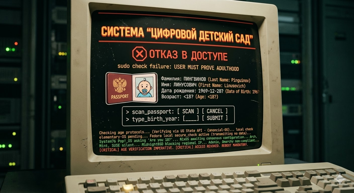 Привет! Пока мы тут спорили о том, какой планировщик ядра быстрее, власти США решили, что операционная система должна работать в режиме «строгой мамочки». Если раньше линуксоиды боролись за свободу кода, то теперь придется бороться за право не показывать паспорт своему собственному терминалу. Ситуация напоминает плохой анекдот: заходит в бар системный администратор, а бармен требует у ядра Linux подтверждение, что админу уже есть 21 год, иначе консоль не выдаст больше одного пакета данных в одни руки. Canonical, как обычно, впереди планеты всей по части интеграции сомнительных фич. Они уже вовсю кодят механизмы проверки. Видимо, скоро при установке Ubuntu мы будем не часовой пояс выбирать, а селфи с паспортом делать. ElementaryOS, как верный спутник, просто ждет, когда в Ubuntu всё допилят, чтобы «перекрасить» готовое решение в свои пастельные тона. Fedora (читай — Red Hat) пытается усидеть на двух стульях. Ребята хотят и закон соблюсти, и приватность не до конца похоронить, реализуя п