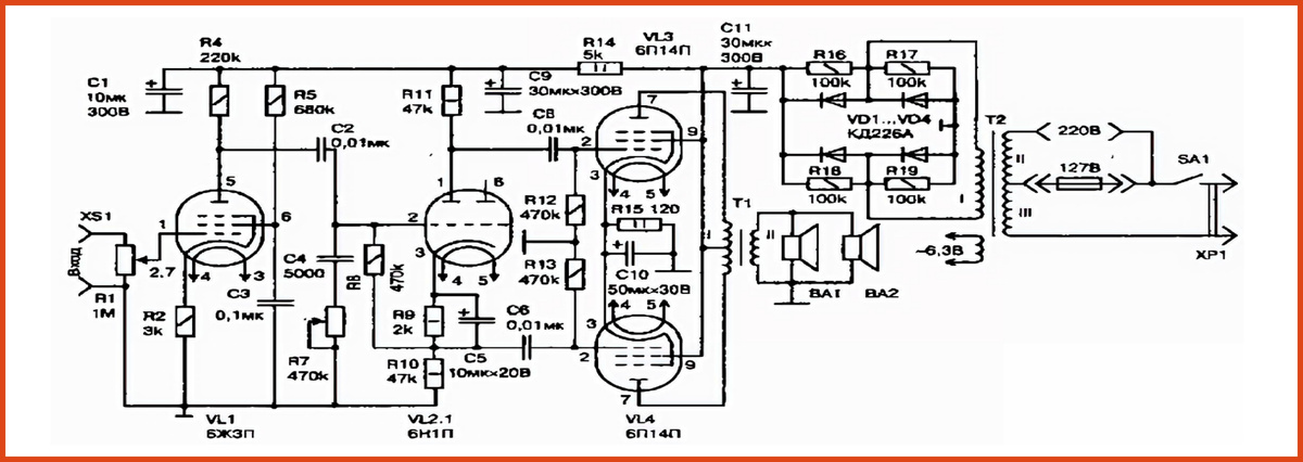 - Выходной каскад (на лампах 6П14П) - обеспечивает основную мощность, подавая сигнал на громкоговоритель через выходной трансформатор.