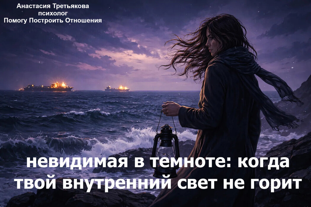 Когда мои клиентки произносят: «Я застряла в одиночестве», за этими словами почти всегда живёт нечто более тонкое. Глубокая усталость от ожидания человека, который наконец увидит их по-настоящему. И одновременно, едва осознаваемый страх того, что однажды это всё же случится. В статье поделюсь, как перестать быть безмолвным мяком в океане затмения. И включить свой внутренний фонарь. Иногда мы так боимся быть уязвимыми, что предпочитаем быть невидимыми. Одиночество - это тихое, почти незаметное ощущение, что жизнь идёт где-то рядом, но не здесь. Как будто вы стоите за стеклом и смотрите на чужой праздник. Представьте: на скалистом берегу стоит маяк. Красивый, крепкий, построенный на совесть. Внутри — тепло, уют и место для двоих. Снаружи — тёмное море, по которому каждую ночь проплывают корабли. Но свет не горит. Корабли идут своим курсом — мимо. Не потому что маяк плохой. И не потому что капитаны слепые. Просто в темноте его не видно. Вот как это выглядит в жизни: вы ходите на свидания,