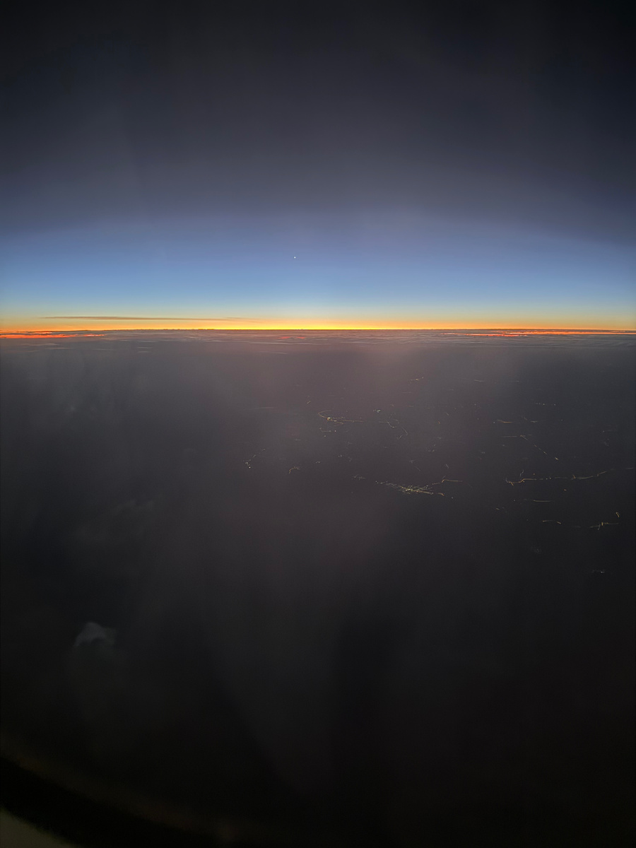 Лететь долго, но иногда открываются красивые виды из иллюминатора. Особенно запомнился рассвет над облаками.