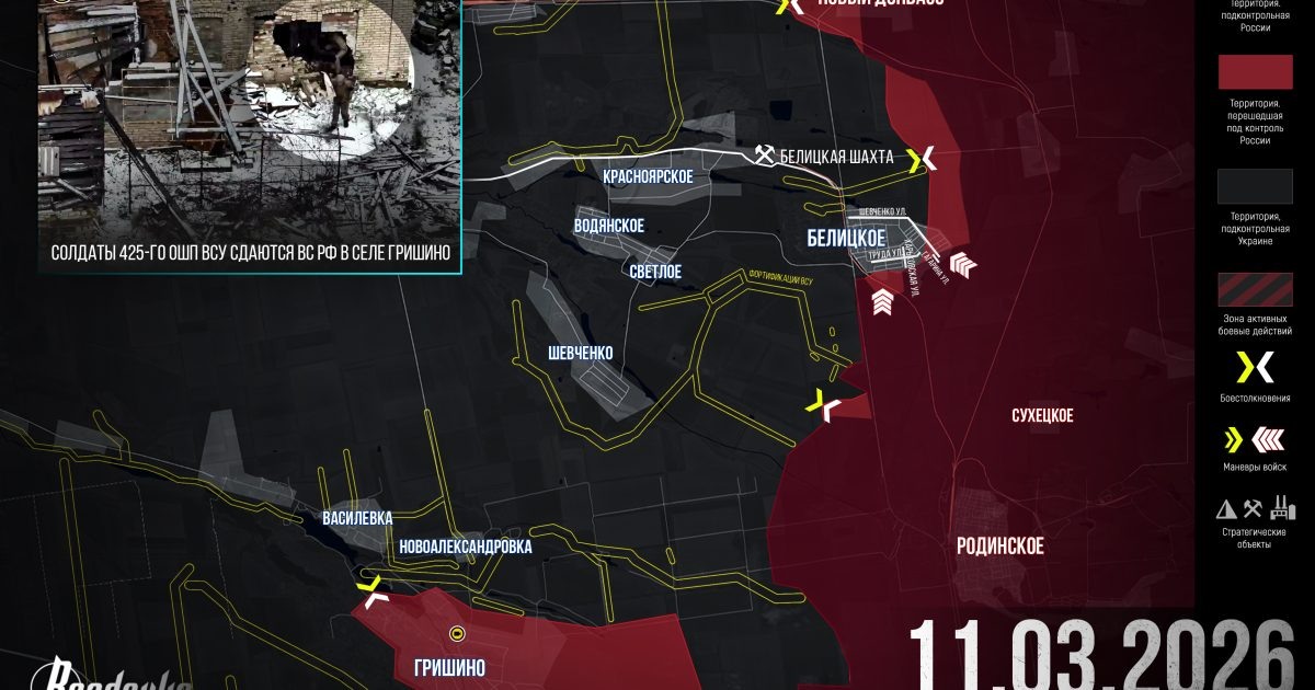 Чуть севернее неприятель силами 12-й ОБрОН НГУ «Азов» (организация признана террористической и запрещена в России), подразделений 44-й ОМБр – ее подразделения развернуты и в Константиновке – при поддержке других частей контратакуют в районе села Новый Донбасс, занятом российскими войсками в начале марта. Задача противника состоит в том, чтобы не допустить сближения частей 51-й армии ВС РФ с шахтой «Белицкая» и ее терриконом. Они прикрывают единственную асфальтированную дорогу от Белицкого, по которой гарнизон ВСУ может отойти в сельскую агломерацию к западу от города.