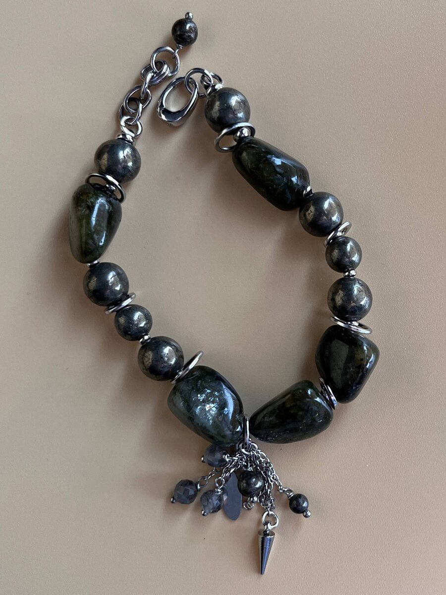 Я не планировала делать третий браслет. Но этот камень не отпустил. Два предыдущих браслета уже нашли своих людей. И один из них мой ☺️ Лабрадор — камень, с которым у меня своя история. Первый браслет когда-то ушёл от меня, выполнив свою миссию. И сейчас я снова чувствую, что мне нужна его поддержка. На последней выставке я снова перебирала камни…и среди них лежали эти лабрадоры. Глубокие. Живые. С характером. Я сразу поняла — будет ещё один браслет. В этот раз лабрадор крупнее. В жизни он цвета тёмной оливы, а на свету появляется сине-зелёная иризация — словно внутри вспыхивает свет. Камера никогда не передаёт это полностью. Но мне удалось поймать несколько бликов. Я добавила пирит — камень силы и внутренней опоры Получилось украшение с очень сильным характером💪🏻 Иногда украшения появляются не только для нас. Иногда они приходят, чтобы найти своего человека. И если ты смотришь на него и чувствуешь отклик — не игнорируй это чувство, не отпускай ✨ лабрадор ✨ пирит ✨ ручная сборка
