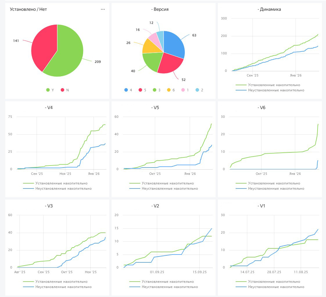 Почему мы не растем в деньгах, хотя растем в числе установок? С этого вопроса началось многоэтапное развитие несложной в итоге аналитической системы, которая позволила перейти к осознанному управлению продуктом. В нашем случае – созданием ИТ-решений для автоматизации бизнес-процессов. А с вами хочу поделиться этим опытом, поскольку его можно применить не только с диджитале. Первая и самая очевидная метрика – количество установленных, но не используемых приложений. Это можно сравнить с товарами, которые заказали, но не выкупили, либо купили, но вернули. Или с посещениями, на которые записались, но отменили, либо не отменяли, но все равно не пришли. Результат – круговая диаграмма с двумя секторами, больший из них – зеленый: активные установки. Продуктов (приложений) у нас – несколько десятков. И теперь видно, на какие стоит обратить внимание в первую очередь: на те, где больше красного цвета (неактивных установок). Это было просто. Но в круговых диаграммах нет динамики, привязки ко време