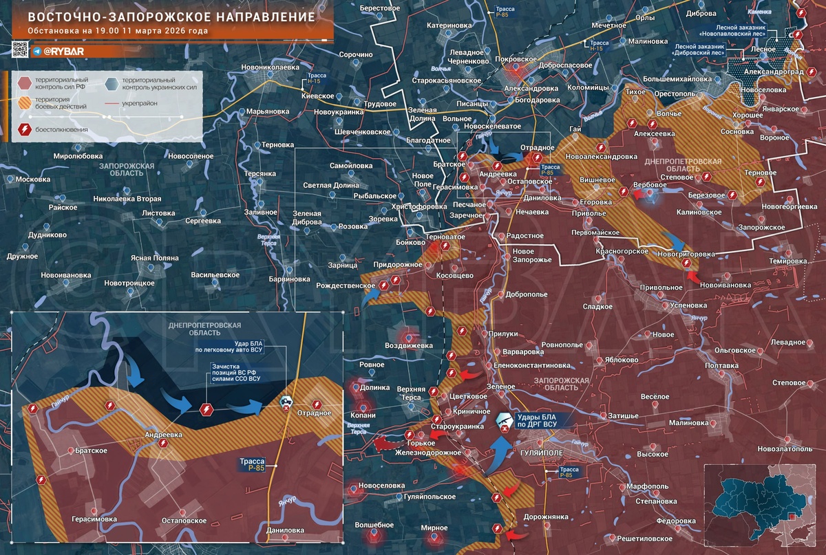 📝 Идут тяжелые бои на Восточно-Запорожском направлении. Укропы не прекращают попыток продвинуться в Днепропетровской области и выбить наши войска с южных окраин. Основная концентрация сил противника наблюдается на рубеже Андреевка — Отрадное, где они, похоже, пытаются закрепиться в северной части Андреевки и в прилегающих укреплениях. Южнее работают дронами. К северу от Гая была предпринята масштабная атака, которую пресекли наши дроноводы и артиллеристы группировки "Восток". В окрестностях Вишневого ещё сохраняется активность групп противника. Ожесточенные столкновения продолжаются западнее реки Гайчур. Укропы пытаются выбить нас из Рождественского и атакуют от Воздвижевки в сторону Прилук. Ранее они пересекали реку и пытались прорваться в тыл. В районе Гуляйполя активны малые группы противника. "Серая зона" к востоку от железной дороги еще не контролируется полностью, и оттуда периодически заходят штурмовые двойки на окраины города. Несмотря на натиск, темпы наступления укропо