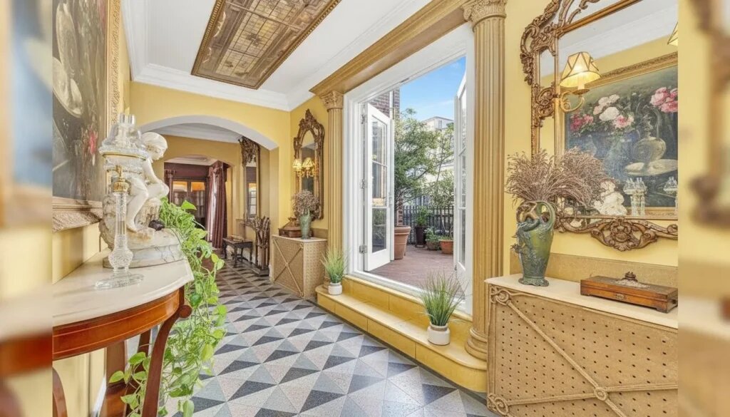 Внутри — три спальни и пять с половиной ванных комнат, что делает его типичной представительной резиденцией верхнего уровня. Планировка и внутренние решения напоминают о грандиозности начала XX века, когда квартиры проектировались для комфортной жизни и приёма гостей.