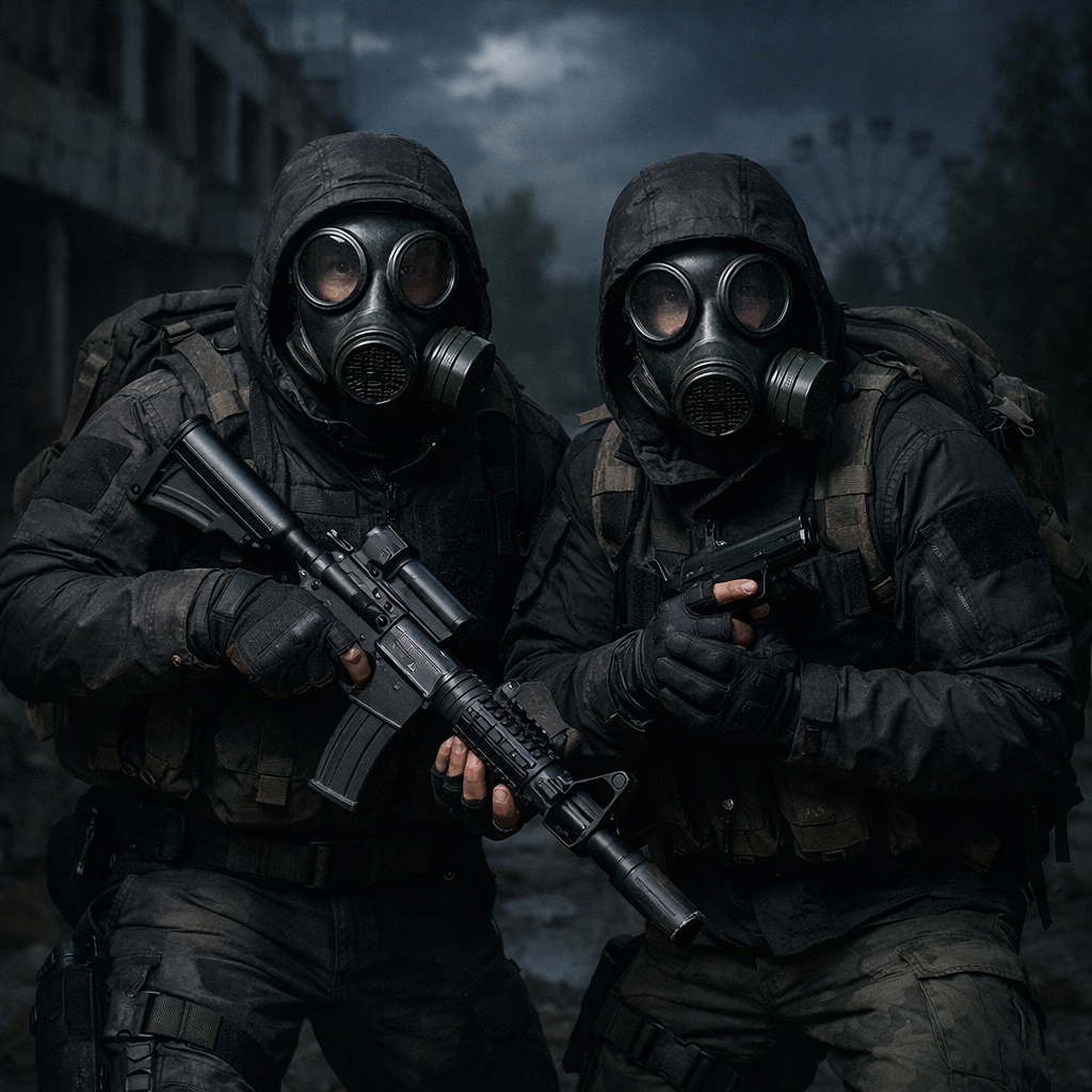 Сталкеры, подгоняемые адреналином, почти не глядя, бежали по темным и мрачным улицам Припяти. Включить фонарь — подписать себе смертный приговор. Город, когда-то полный жизни и надежд, теперь представлял собой зловещее напоминание о катастрофе. Облупившиеся стены зданий, покрытые граффити и следами времени, казались живыми, как будто сами стены шептали о давно забытых днях.