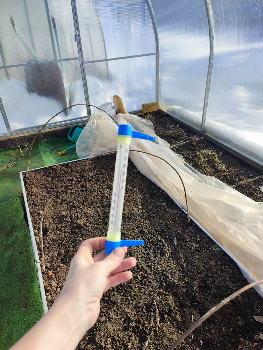 Откинула плёнку со средней грядки. А там градусник такое показывает ...