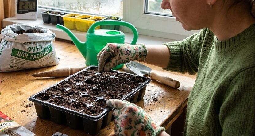 Грунт нужен легкий, питательный, влагоемкий и воздухопроницаемый. Можно купить готовую почвосмесь для рассады пасленовых или приготовить самостоятельно: смешайте 2 части огородной земли, 1 часть перегноя или компоста, 1 часть торфа и 1 часть песка или вермикулита. Для профилактики болезней грунт желательно пролить слабым раствором марганцовки или Фитоспорином за пару дней до посева.