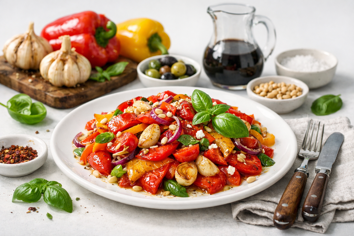 Есть салаты, которые звучат просто, а на деле работают как кнопка «вернись в лето». Запечённый сладкий перец даёт сладость и дымный аромат, чеснок добавляет характер, а масло собирает всё в один яркий вкус. Делается быстро, выглядит празднично, съедается первым.
