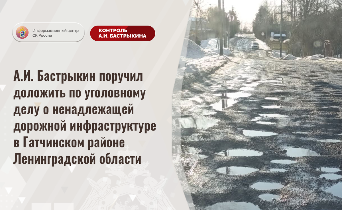 А.И. Бастрыкин поручил доложить по уголовному делу о ненадлежащей дорожной инфраструктуре в Гатчинском районе Ленинградской области В сети Интернет сообщается, что длительное время автомобильная дорога в Гатчинском районе Ленинградской области, соединяющая деревни Малое Замостье и Сабры, находится в непригодном состоянии и разрушается, на ее поверхности образовались многочисленные ямы. В результате проезд транспортных средств, в том числе автомобилей экстренных служб и школьного автобуса, затруднен. Несмотря на имеющиеся нарушения, мер к организации ремонтных работ не принимается. В СУ СК России по Ленинградской области возбуждено уголовное дело. Председатель Следственного комитета Российской Федерации Александр Иванович Бастрыкин поручил руководителю СУ СК России по Ленинградской области Сергею Тихоновичу Сазину доложить о ходе и результатах расследования уголовного дела. Исполнение поручения поставлено на контроль в центральном аппарате ведомства. #СледственныйКомитет #СКРоссии #СК