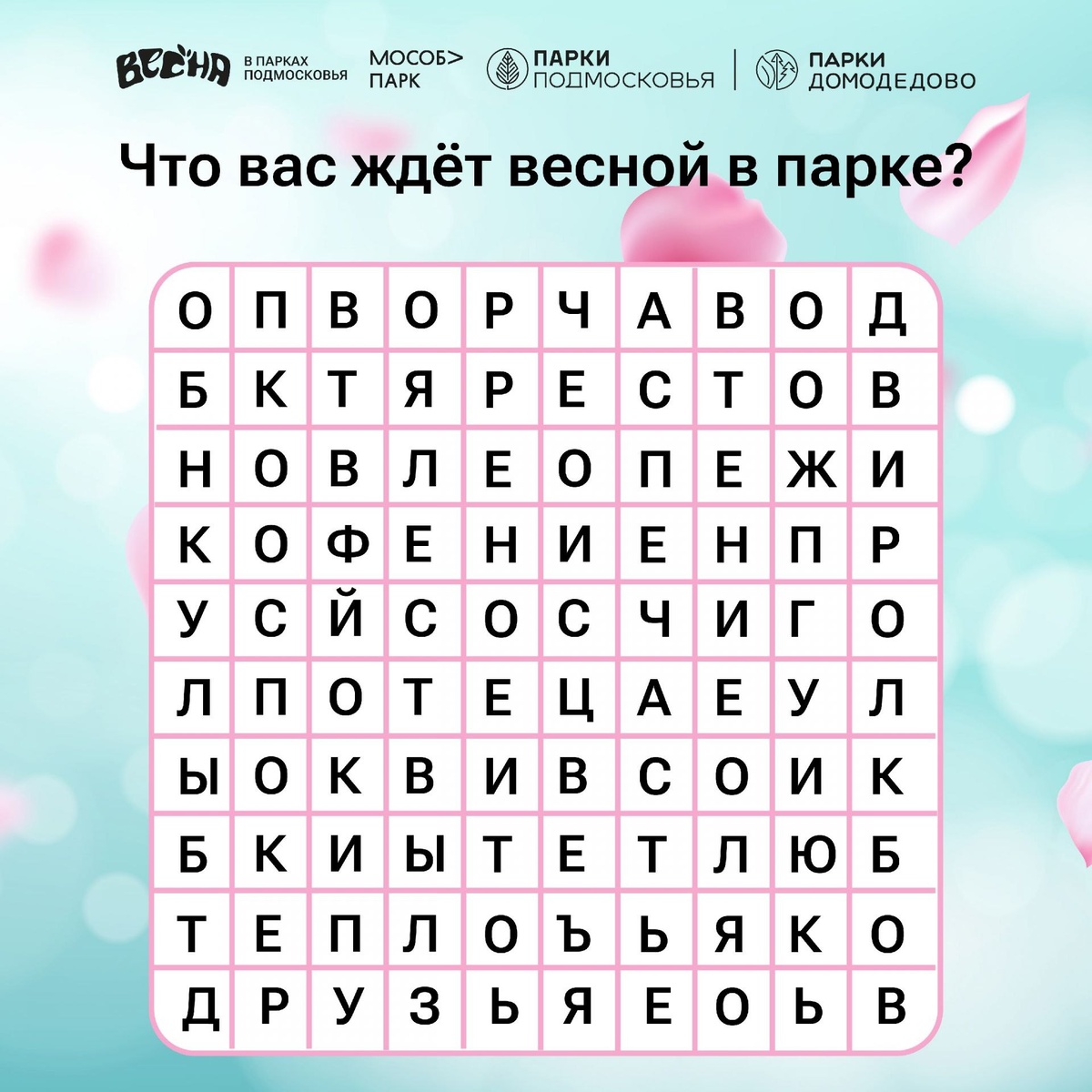 ✨ Весна пришла в парки Домодедово! 🌿 Внимательно всмотритесь в эти буквы: здесь скрыт особый смысл. Предлагаем вам увлекательную игру - найдите слова, которые расскажут, какой будет весна в этом году 😉 ✅ Мероприятия Домодедово https://dzen.ru/id/66f10385cc4c5a16f7b5fb02 https://vk.ru/domodedovo_events http://dzen.ru/domodedovo_events