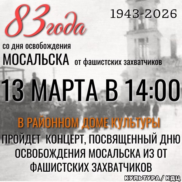 🔥Друзья, приглашаем вас на концерт, посвященный дню освобождения Мосальского района от фашистских захватчиков