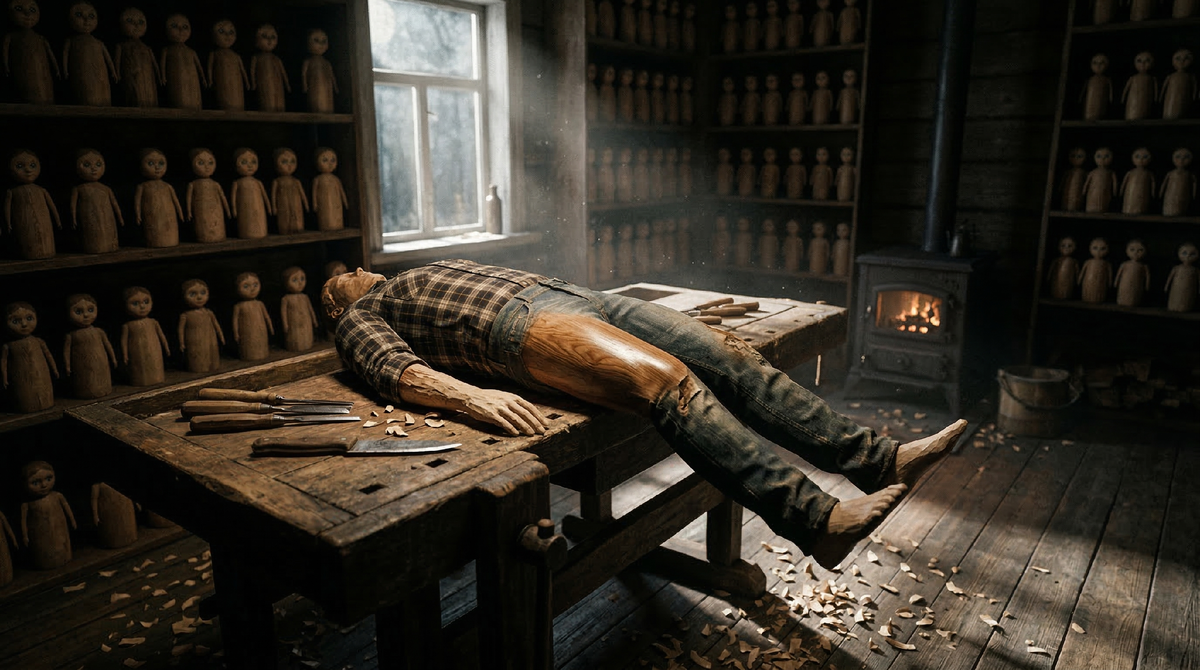 Я подошёл к верстаку. Там лежала неоконченная работа. Фигура мужчины. Я присмотрелся и почувствовал, как волосы на затылке зашевелились. Черты лица были ещё грубыми, но одежда... это были мои джинсы и моя старая фланелевая рубашка, которую я оставил в дедовском доме. Старик вырезал меня.