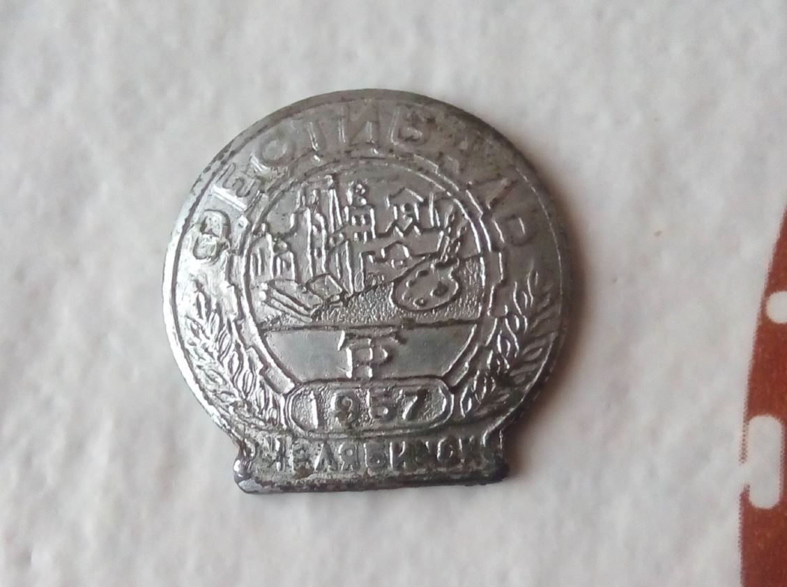 Различных фестивальных было выпущено много, а вот таких - с серебрением (или каким-то напылением), видимо, было выпущено мало. Судя по всему, он крепился при помощи длинной иглы, которая просто втыкалась вертикально вниз в одежду.