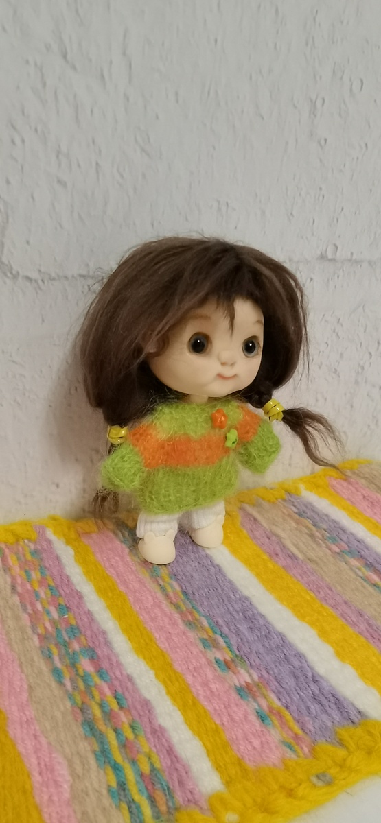Строго говоря - два с половиной наряда. Потому что на маленькую Динку был связан только новый пушистый свитерок. Штаны остались от прежнего комплекта. Снять их она отказалась наотрез.