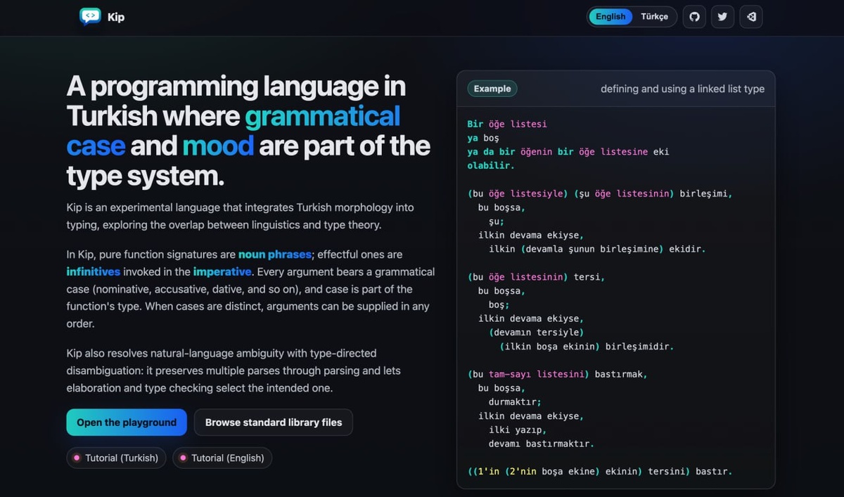 Это экспериментальный проект, который использует турецкую морфологию для типов — падежи (именительный, винительный, дательный) и наклонения определяют сигнатуры функций, аргументы можно подавать в любом порядке, если падежи разные. Чистые функции — как существительные, с побочками — как инфинитивы в повелительном. Для лингвистов и фанатов эзотерических языков: https://kip-dili.github.io/ @tproger Читайте также в VK, Max и Дзен