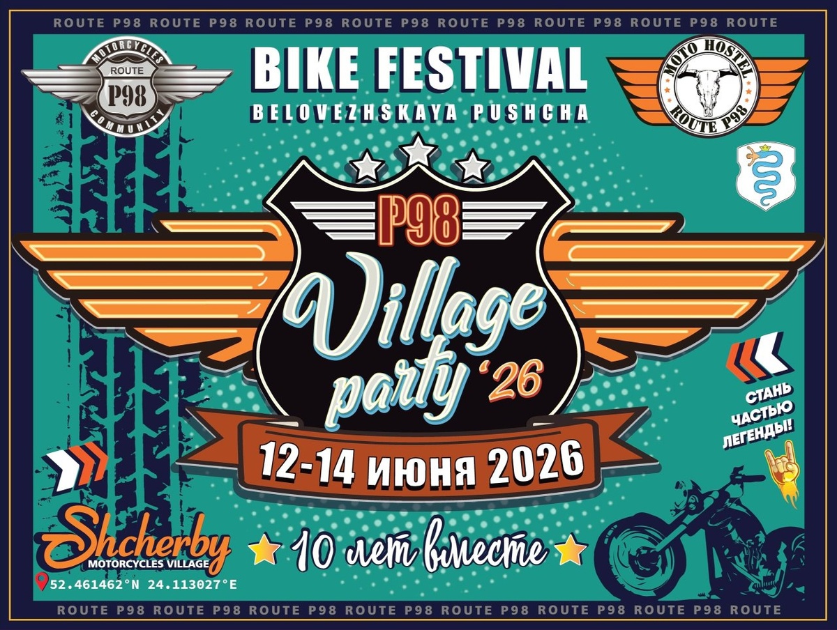 X-й фестиваль мототуризма Village party 2026 (Щербы) Мотофесты RSS Лето. Лес. Рёв моторов. Песни у костра. Знакомо? Тогда мы точно говорим на одном языке! «Route P98» с гордостью приглашает вас на 10-й юбилейный фестиваль поддержки и развития мототуризма Республики Беларусь — «Village party»! Представьте: Вы мчитесь по лесным тропам Беловежской пущи на своём байке — ветер в лицо, дорога зовёт, а вокруг — вековые деревья и дух приключений! Вечером — уютная атмосфера у костра: гитара, истории от мотопутешественников со всего мира, смех и разговоры до рассвета. Музыка, новые друзья, атмосфера свободы — вот ради чего мы все здесь! Где? Мотоциклетная деревня Щербы — сердце мототуристической жизни на краю легендарной Беловежской пущи. Когда? 12–14 июня 2026 года. Что вас ждёт: захватывающие мотоэкскурсии по красивейшим местам региона; эндуро поход для смелых и опытных райдеров; живые выступления крутых музыкантов; дух «old school»: блеск металла, рёв моторов и традиции... Пере