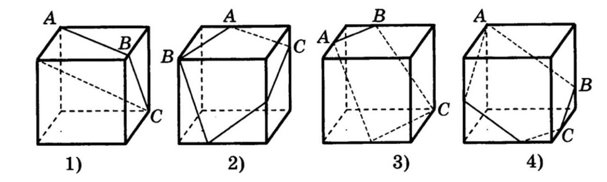 3. На каком рисунке изображено сечение куба плоскостью АВС?