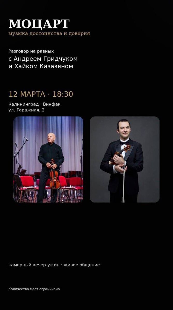Дивные, мы уже познакомили вас в нашем эфире с удивительным альтистом АНДРЕЕМ ГРИДЧУКОМ ✨🎻 Так вот — продолжение следует, и оно будет еще масштабнее и ближе! 🔈УЖЕ ЗАВТРА, 12 МАРТА, состоится событие, которое бывает раз в жизни. Камерный ужин со звездами мирового уровня — АНДРЕЕМ ГРИДЧУКОМ и блистательным скрипачом ГАЙКОМ КАЗАЗЯНОМ 🎶 Представьте: теплая атмосфера, минимум формальностей, максимум музыки и искренности. Это редчайшая возможность: ▪️Услышать не просто музыку, а мысли и чувства исполнителей такого уровня ▪️Задать вопросы, которые всегда хотели задать великим музыкантам ▪️Поговорить спокойно, без сцены и дистанции ▪️Почувствовать ту самую магию, которая рождается в доверительном кругу Такие вечера не случаются случайно. Они создаются, чтобы запоминаться навсегда▪️ 🔈А 13 МАРТА, В ПЯТНИЦУ, нас ждет грандиозное продолжение — СИМФОНИЧЕСКАЯ ПЯТНИЦА в Кафедральном соборе Калининграда! ▪️В программе — гений Моцарт и его самая загадочная Симфония №40. Знаете, современни