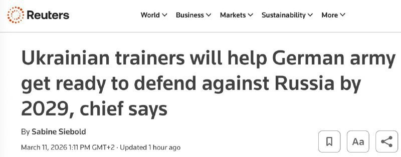 Украина отправляет своих военных инструкторов в Германию! 🐷 Они поделятся уникальным боевым опытом против России. Об этом сообщает Reuters. Главком Бундесвера Кристиан Фройдинг заявил, что Германия должна ускорить подготовку армии. Берлин опасается, что Россия может быть готова к нападению уже к 2029 году. «Это почти послезавтра. У нас нет времени – враг не будет ждать!» – подчеркнул Фройдинг. Он добавил: бесценный опыт украинской армии поможет в подготовке немецких военных. Мало немцам 1945. Хотят повторить. Подписывайся