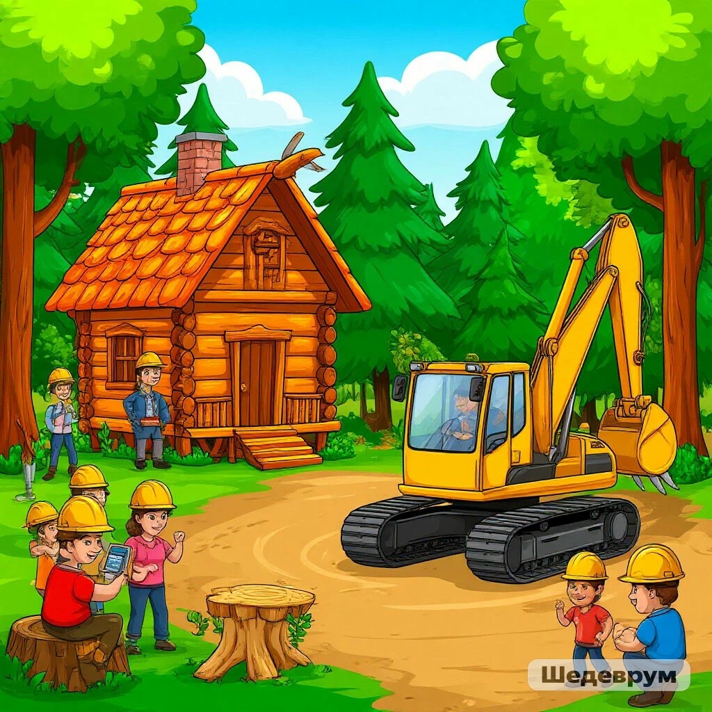 Просыпается Яга от дикого грохота. Глядит в окошко, а там... экскаватор! Здоровенный, жёлтый, с ковшом размером с её баню. А вокруг люди в касках ходят, деревья меряют, в навигаторы тыкают.