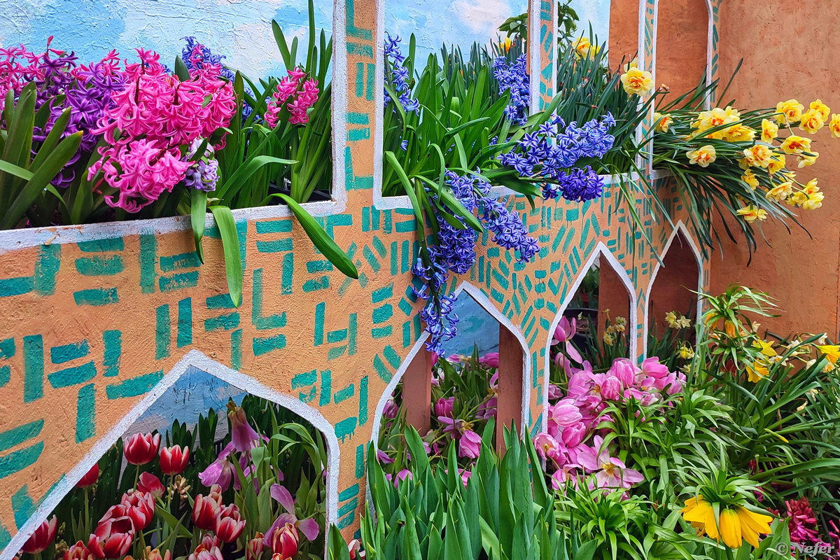 Было много необычных видов тюльпанов: темные, почти черные и с бахромой на кончиках лепестков. А какие нарциссы! Оттенки от белого до ярко-желтого, с выраженным граммофончиком и разной степени махровости. На фото фритиллярия или рябчик королевский. Еще были цветы в вазах: дельфиниумы, а также всякая экзотика типа протей и леукоспермумов.