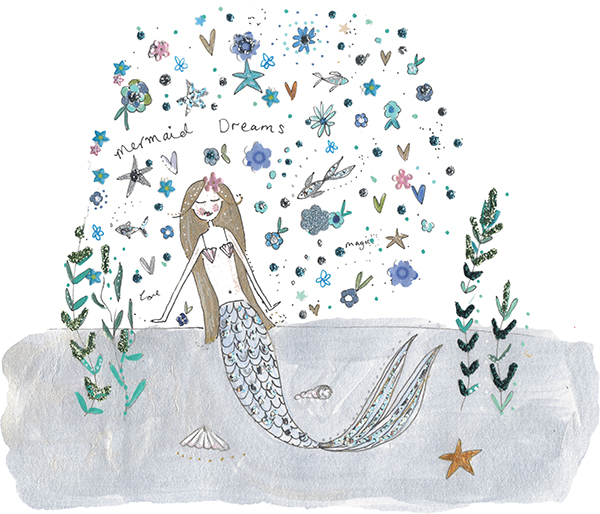 Продолжаем серию статей про раскрытие творческого потенциала через каракули: Все наши статьи по изобразительному искусству здесь. Этот образ русалки как личный вызов — большинство никогда не чувствовали себя уверенно, рисуя людей или лица. Но когда она появилась на бумаге, нас охватило настоящее очарование. Надеемся, ваша русалка тоже заворожит вас своей грацией и магией! ШАГ 1: Карандашом, опираясь на шаблон как на ориентир, наносим русалку на выбранную поверхность. Меняем её по своему вкусу: добавляем кудрявые волосы, удлиняем хвост или меняем позу — пусть она станет именно вашей! ШАГ 2: Когда карандашный набросок готов, обводим все линии чёрной ручкой, а затем стираем карандашные следы. Вокруг неё, в круге из точек, полностью отдаёмся свободным каракулям: рисуем рыбок, цветы, звёздочки, слова, имена или целую цитату — всё, что подсказывает фантазия. ШАГ 3: Для песчаного дна берём нежную золотистую заливку чернилами (или песочный карандаш/краску). Можно усилить морское дно водорослям