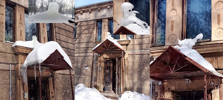 На снимке три дня из жизни сталагмита: 9 февраля, 10 и 11 марта. В уголках — увеличенное изображение («динозавра» увеличивать не стал, а днём он с грохотом свалился). А сегодня (11.03) в отстойнике (вырыли, чтоб можно было разойтись на тропинке/канаве), окруженный с трёх сторон полуметровым снегом, пробился пролесок.