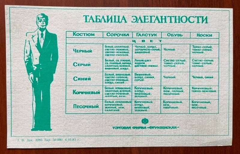 ! Если сегодня состоятельные люди обращаются к специалистам по подбору одежды (тем самым фэшн-байерам) для создания стильного образа, то в 1983 году достаточно было заглянуть в методичку. В таблицу элегантности. Такую придумала и напечатала тиражом 50000 экз. торговая фирма «Фрунзенская» для всех мужчин с необъятных просторов СССР. У кого-нибудь она сохранилась?