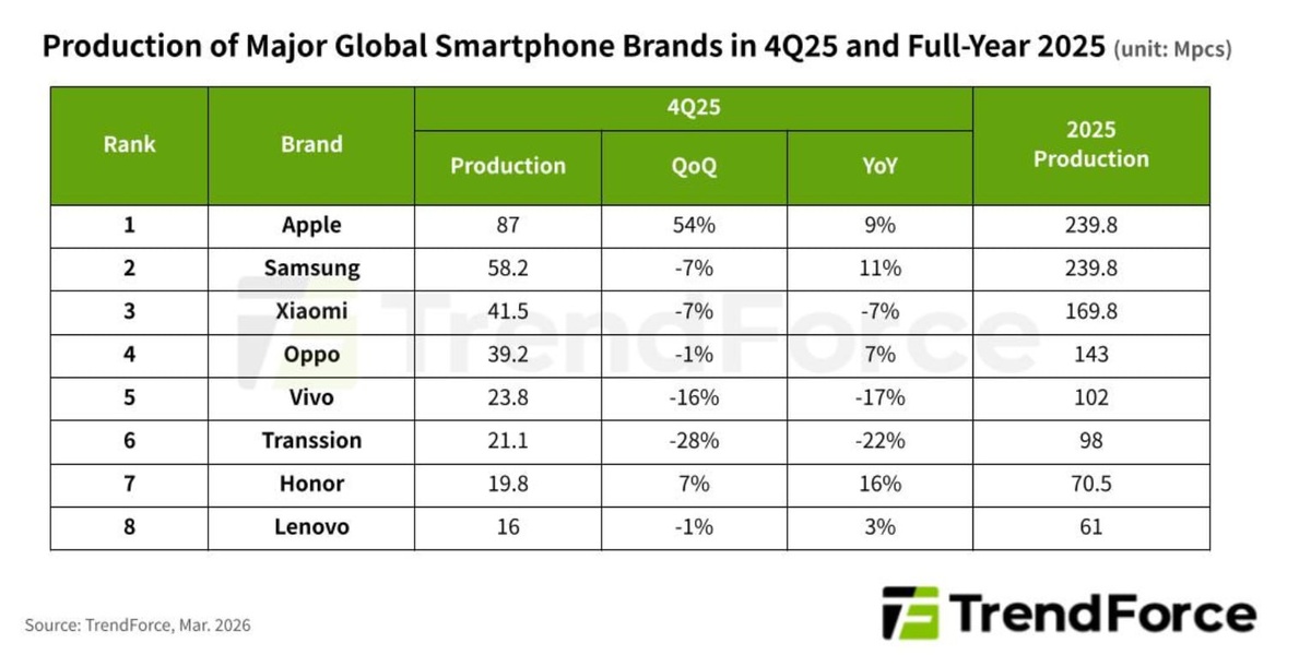 Согласно последнему отчету TrendForce, Apple и Samsung произвели практически идентичное количество смартфонов в 2025 году — по 240 миллионов устройств каждая. Это позволило обеим компаниям разделить первое место в мировом рейтинге производителей. Общий объем производства смартфонов на планете достиг 1,254 миллиарда штук, что на 2,5% больше показателей предыдущего года. Первая половина года прошла под знаком государственных субсидий в Китае, стимулировавших спрос, а вторая — традиционно оказалась успешной благодаря запуску флагманских новинок. Apple продемонстрировала впечатляющий рывок в конце года после презентации линейки iPhone 17. Производство смартфонов компании в четвертом квартале, по сравнению с предыдущим, выросло более чем на 50%. TrendForce отмечает, что серия iPhone 17 выиграла за счет грамотной ценовой стратегии — судя по всему, в Купертино наконец поняли, что не все готовы продать почку ради нового телефона. Аналитики намекают: если Apple продолжит придерживаться агресси
