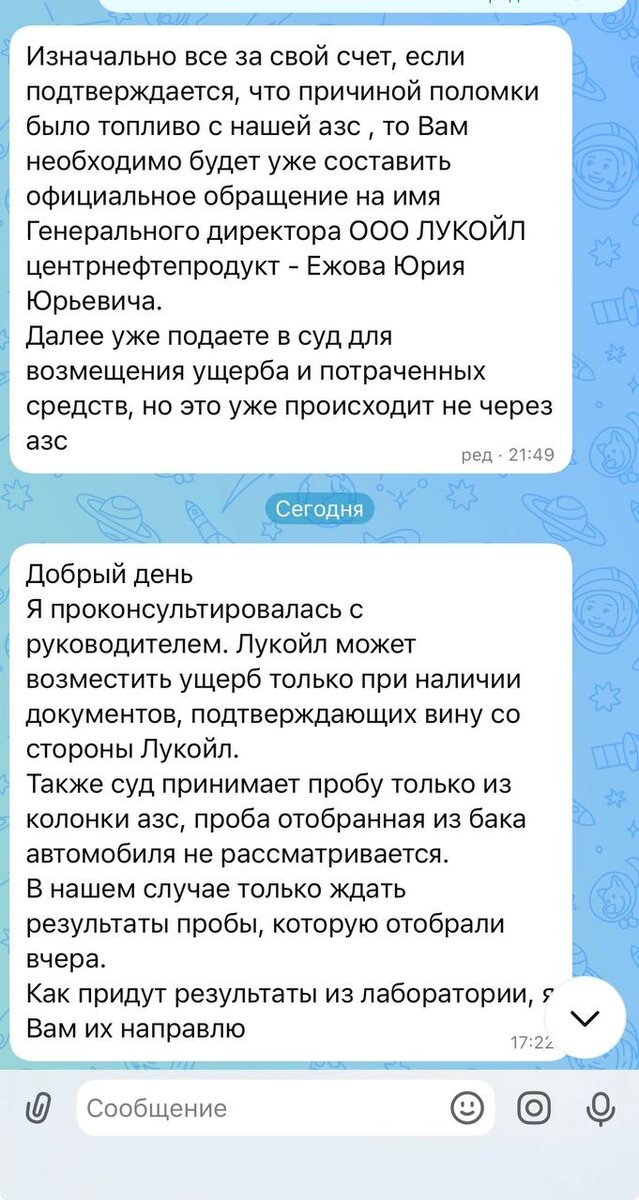 Ситуация такова. 07.03 заправила на своей обычной заправке полный бак аи95. Через минут 20-30 машина начала дергаться, вибрировать, стала с трудом разгоняться. То горит, то мигает значок «двигатель» (а/м Киа Рио). Написала обращение через горячую линию Лукойла. Пригласили для отбора пробы с колонки. Вот только в день отбора утром был налив топлива в емкость АЗС и на анализ увезли не совсем то что лили в бак. Сказали привезти заключение СТО по связи состояния автомобиля с топливом. Сто такие справки не дают. Переписку прилагаю. В кратце - если сломается что то, идите в суд, но перспективы что то доказать туманны. Что сейчас лучше сделать? Кто и как выходил из похожей ситуации? Заранее спасибо!