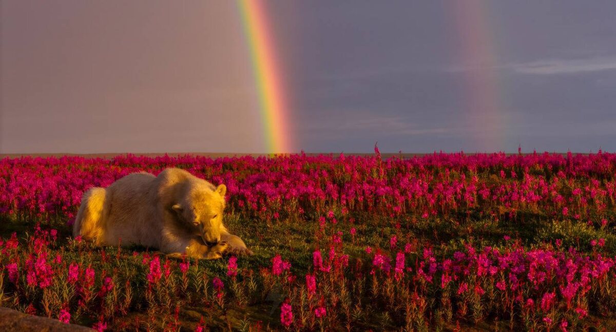 Канадский фотограф поймал удивительный кадр в Арктике: белый медведь бродит по розовым цветам тундры у Гудзонова залива под огромной радугой. Косолапый словно задумался о вечном — ждет, когда придет зима и вода снова замерзнет, чтобы можно было выйти на охоту. @eNewsmd.online 👈 Подписывайтесь на наш канал