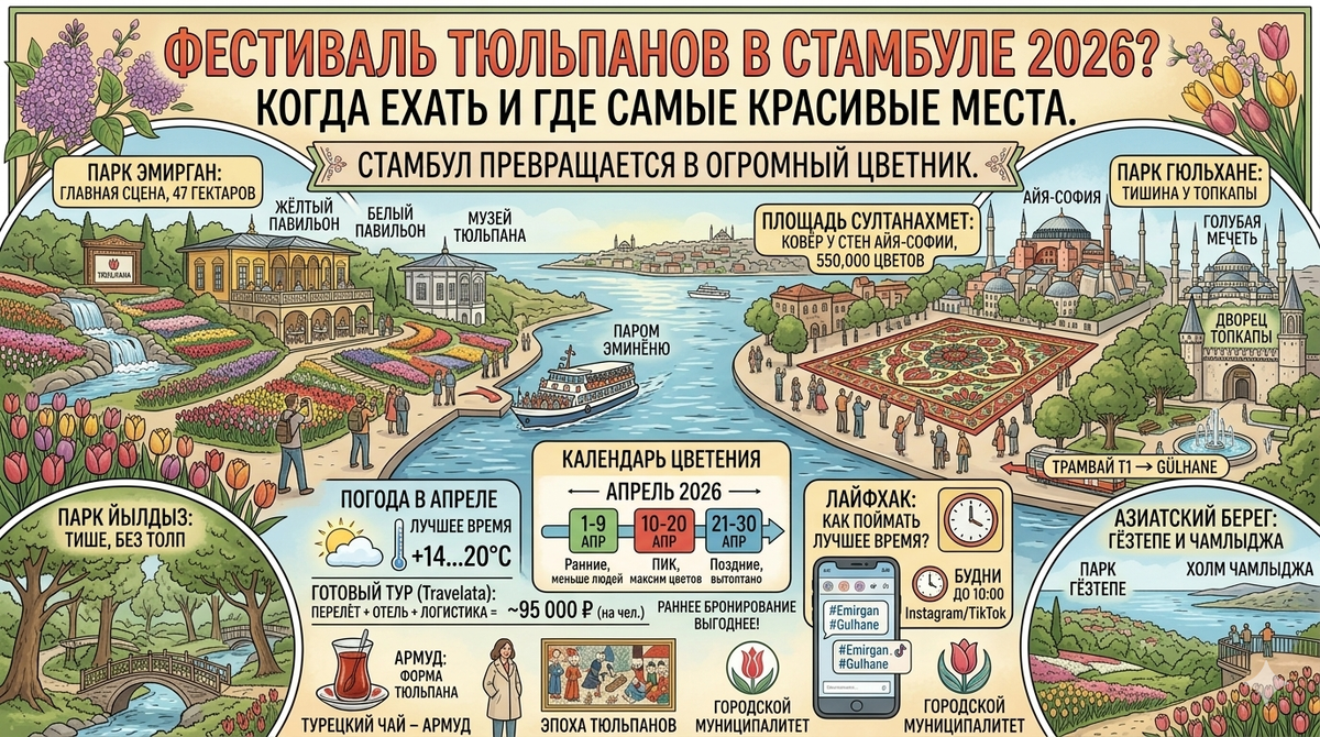 Раннее апрельское утро, паром медленно идёт вдоль Босфора, а берег перед вами — сплошной ковёр из красных, жёлтых и фиолетовых цветов. Это не Голландия. Это Стамбул — город, который каждую весну превращается в один огромный цветник.