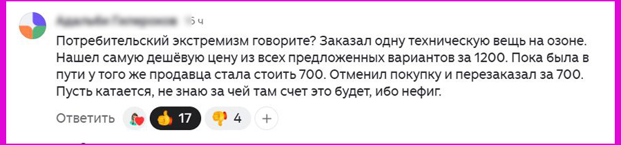 Помню, заказала кроссовки. Пока они ехали до моего пункта выдачи, цена на них уменьшилась на 500 рублей. Я даже слегка обиделась. Кроссовки мне нравились, и подошли по размеру. И тут сама сотрудница ПВЗ мне говорит: — «А ты откажись и просто снова закажи по новой цене. Я всегда так делаю!»