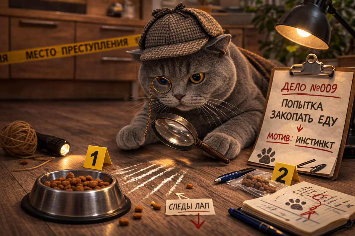 Иногда корм воспринимается именно как добыча, которую лучше замаскировать. Инстинкт работает примерно так: «Это моё. Я к этому ещё вернусь. Но пока спрячем, чтобы никто не догадался.»